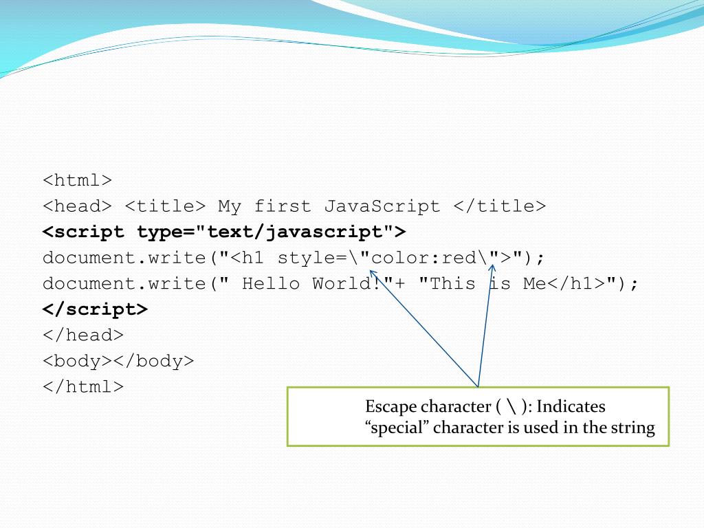 <html> <head> <title> My first JavaScript </title> <script type="text/javascript"> document.write("<h1 style=\"color:red\">"); document.write(" Hello World!"+ "This is Me</h1>"); </script> </head> <body></body> </html> • Escape character ( \ ): Indicates “special” character is used in the string