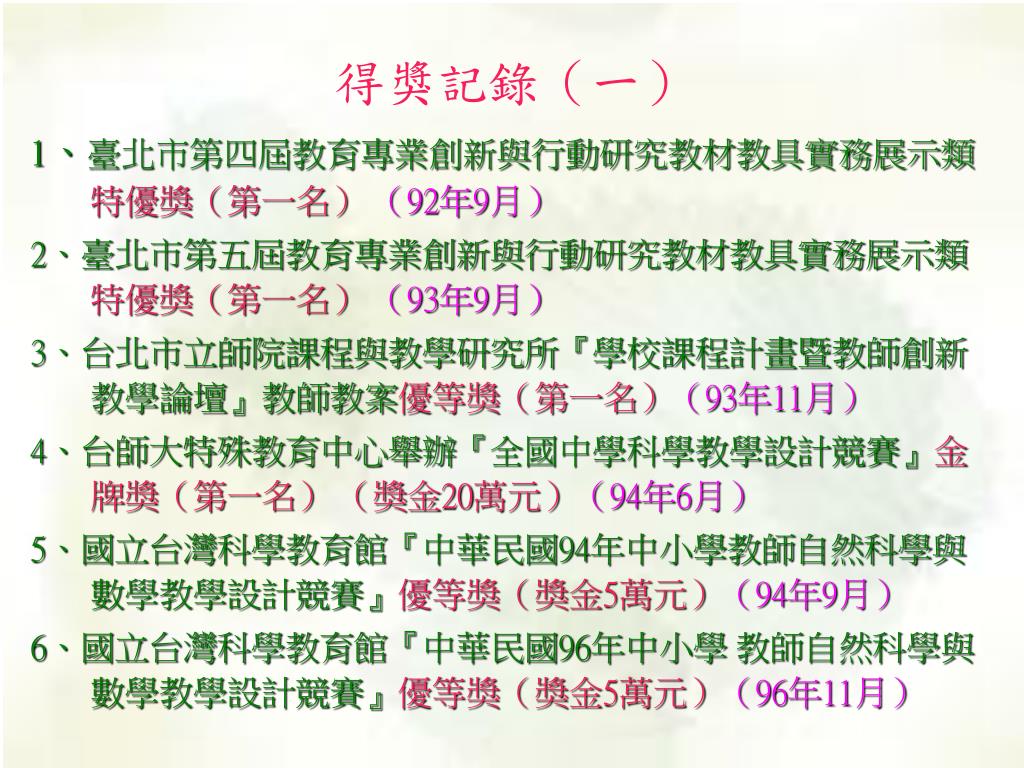 得獎記錄(一) 1、臺北市第四屆教育專業創新與行動研究教材教具實務展示類特優獎(第一名) (92年9月) 2、臺北市第五屆教育專業創新與行動研究教材教具實務展示類特優獎(第一名) (93年9月) 3、台北市立師院課程與教學研究所『學校課程計畫暨教師創新教學論壇』教師教案優等獎(第一名)(93年11月) 4、台師大特殊教育中心舉辦『全國中學科學教學設計競賽』金牌獎(第一名) (獎金20萬元)(94年6月) 5、國立台灣科學教育館『中華民國94年中小學教師自然科學與數學教學設計競賽』優等獎(獎金5萬元)(94年9月) 6、國立台灣科學教育館『中華民國96年中小學 教師自然科學與數學教學設計競賽』優等獎(獎金5萬元)(96年11月)