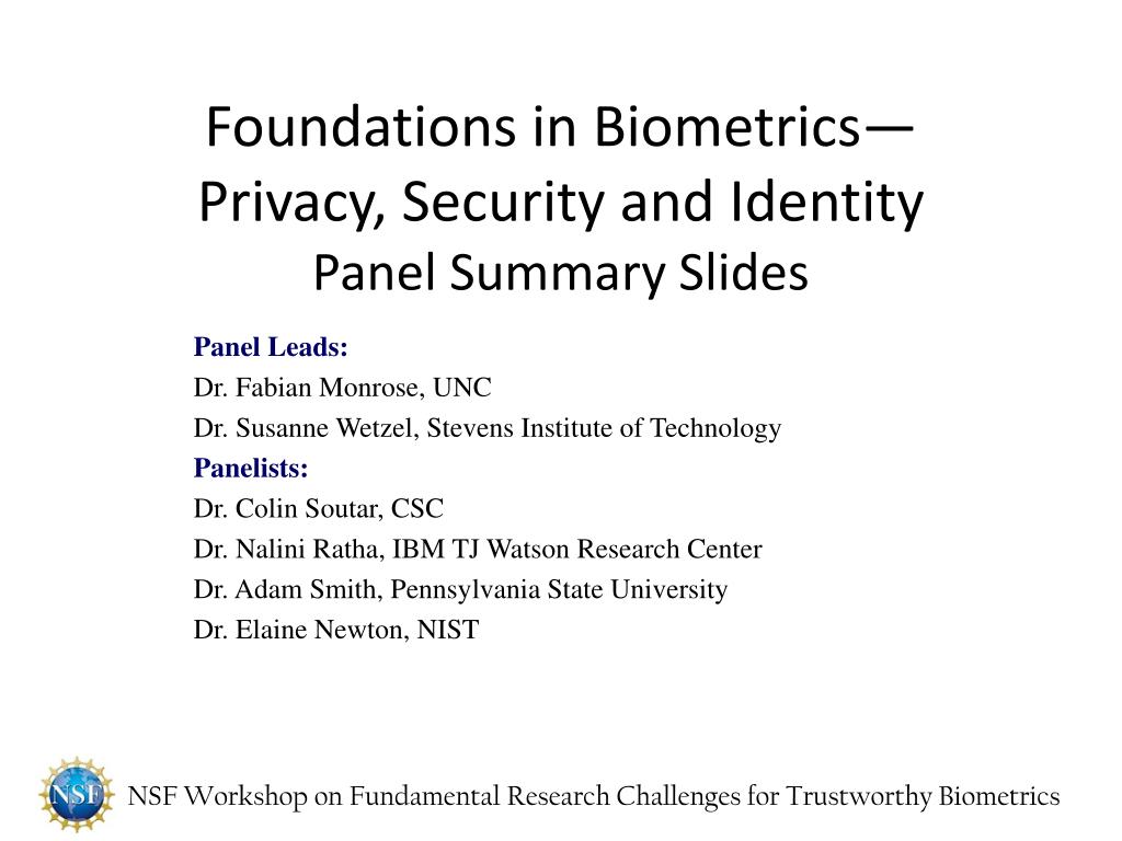 Foundations in Biometrics—Privacy, Security and IdentityPanel Summary Slides Panel Leads: Dr. Fabian Monrose, UNC Dr. Susanne Wetzel, Stevens Institute of Technology Panelists: Dr. Colin Soutar, CSC Dr. NaliniRatha, IBM TJ Watson Research Center Dr. Adam Smith, Pennsylvania State University Dr. Elaine Newton, NIST