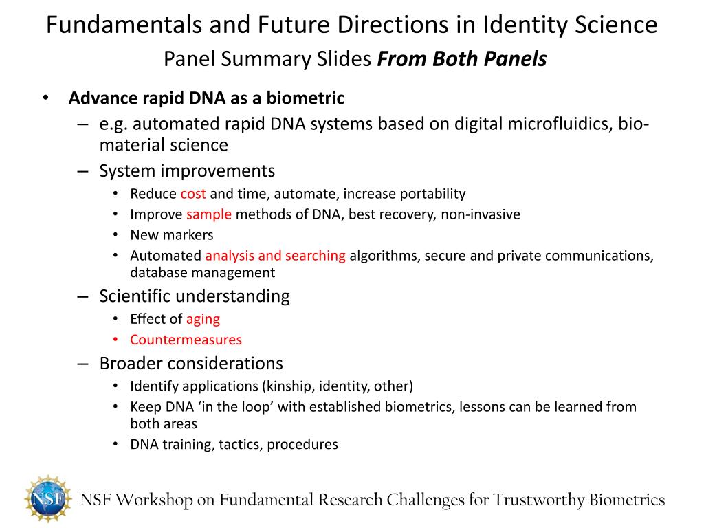 Fundamentals and Future Directions in Identity SciencePanel Summary Slides From Both Panels • Advance rapid DNA as a biometric • e.g. automated rapid DNA systems based on digital microfluidics, bio-material science • System improvements • Reduce costand time, automate, increase portability • Improve samplemethods of DNA, best recovery, non-invasive • New markers • Automated analysis and searching algorithms, secure and private communications, database management • Scientific understanding • Effect of aging • Countermeasures • Broader considerations • Identify applications (kinship, identity, other) • Keep DNA ‘in the loop’ with established biometrics, lessons can be learned from both areas • DNA training, tactics, procedures