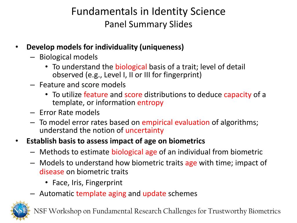 Fundamentals in Identity SciencePanel Summary Slides • Develop models for individuality (uniqueness) • Biological models • To understand the biological basis of a trait; level of detail observed (e.g., Level I, II or III for fingerprint) • Feature and score models • To utilize feature and score distributions to deduce capacity of a template, or information entropy • Error Rate models • To model error rates based on empirical evaluation of algorithms; understand the notion of uncertainty • Establish basis to assess impact of age on biometrics • Methods to estimate biological age of an individual from biometric • Models to understand how biometric traits age with time; impact of disease on biometric traits • Face, Iris, Fingerprint • Automatic template aging and update schemes