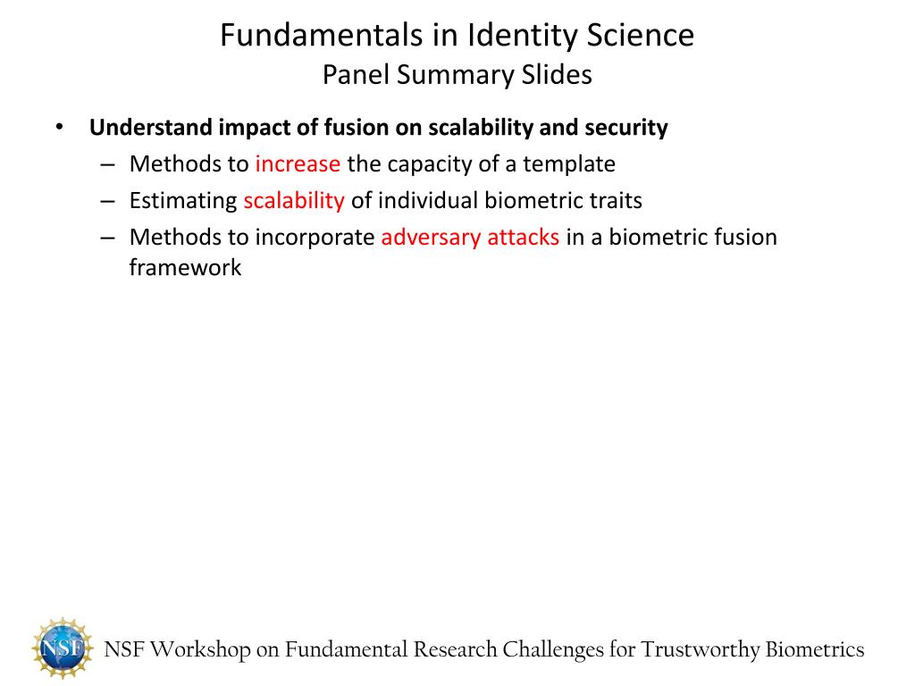 Fundamentals in Identity SciencePanel Summary Slides • Understand impact of fusionon scalability and security • Methods to increase the capacity of a template • Estimating scalability of individual biometric traits • Methods to incorporate adversary attacks in a biometric fusion framework