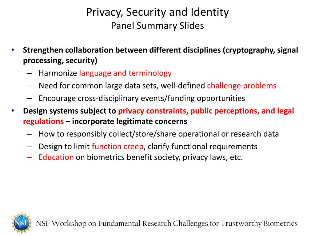 Strengthen collaboration between different disciplines (cryptography, signal processing, security) Harmonize language and terminology Need for common large data sets, well-defined challenge problems Encourage cross-disciplinary events/funding opportunities Design systems subject to privacy constraints, public perceptions, and legal regulations – incorporate legitimate concerns How to responsibly collect/store/share operational or research data Design to limit function creep, clarify functional requirements Education on biometrics benefit society, privacy laws, etc. Privacy, Security and IdentityPanel Summary Slides