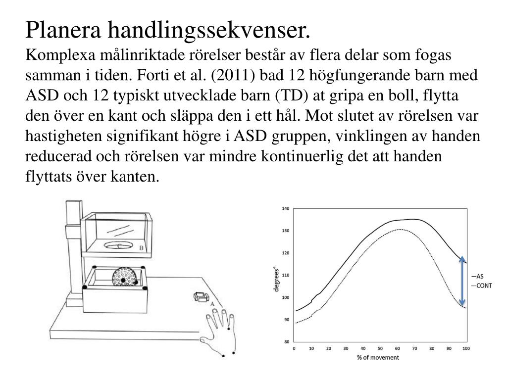Planera handlingssekvenser. Komplexa målinriktade rörelser består av flera delar som fogas samman i tiden. Forti et al. (2011) bad 12 högfungerande barn med ASD och 12 typiskt utvecklade barn (TD) at gripa en boll, flytta den över en kant och släppa den i ett hål. Mot slutet av rörelsen var hastigheten signifikant högre i ASD gruppen, vinklingen av handen reducerad och rörelsen var mindre kontinuerlig det att handen flyttats över kanten.