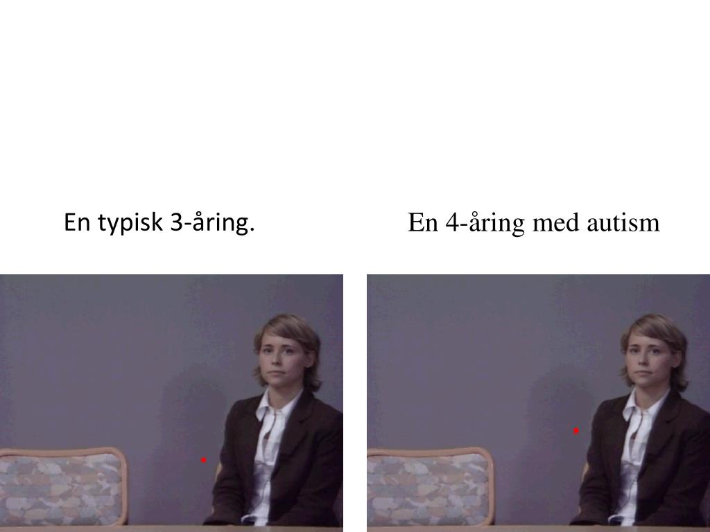 Prediktivt tittande på en konversation Von Hofsten, Uhlig, Adell & Kochukhova (2009) Research in Autism Spectrum Disorder, 3, 556-569. En viktig social förmåga är att förstå och förutsäga andra individers kommunikationer; vad som kommer att sägas och av vem. Hur bra förstår barn med autism denna process? Vi studerade 10 3-6 år gamla barn med autism och två andra normalgrupper: 1-åringar och 3-åringar när de tittade på en konversation. Vi använde 2 mått: Hur de tittade på deltagarnas ansikten och hur ofta de tittade på nästa talare innan hon börjat tala.