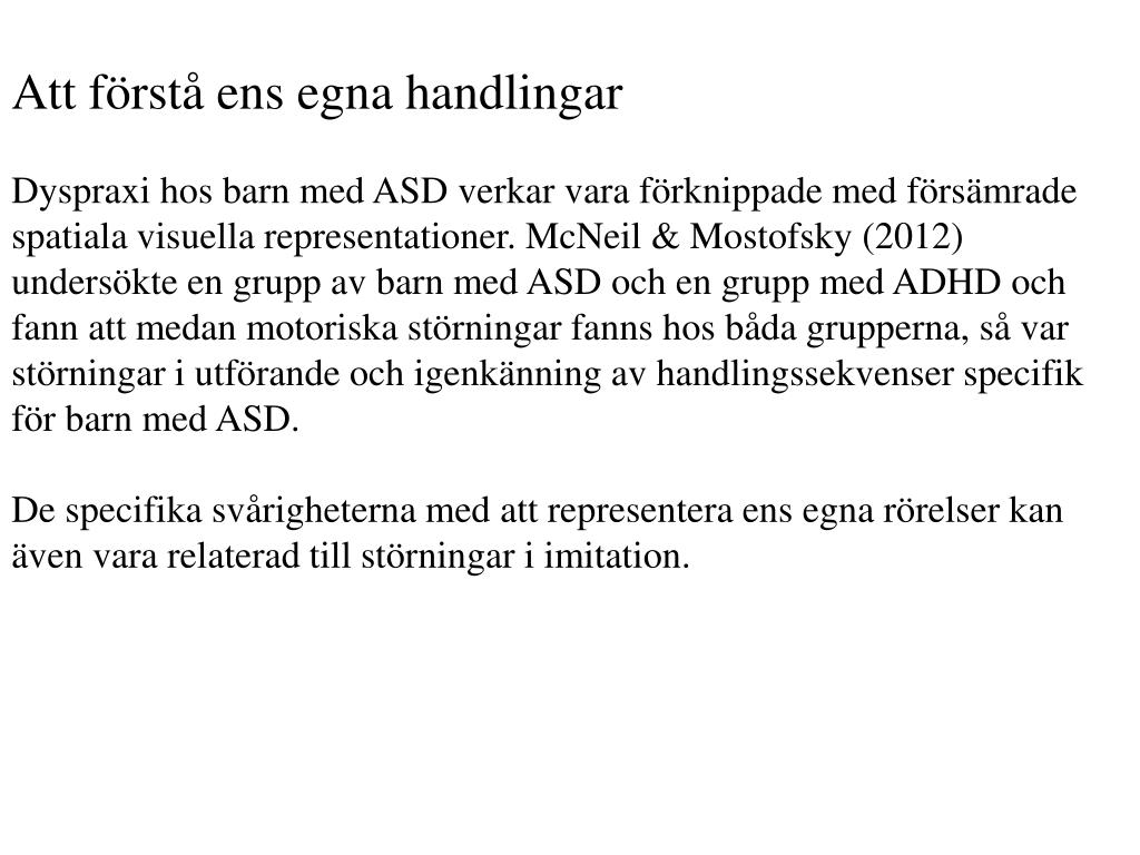 Att förstå ens egna handlingar Dyspraxi hos barn med ASD verkar vara förknippade med försämrade spatiala visuella representationer. McNeil & Mostofsky (2012) undersökte en grupp av barn med ASD och en grupp med ADHD och fann att medan motoriska störningar fanns hos båda grupperna, så var störningar i utförande och igenkänning av handlingssekvenser specifik för barn med ASD. De specifika svårigheterna med att representera ens egna rörelser kan även vara relaterad till störningar i imitation.