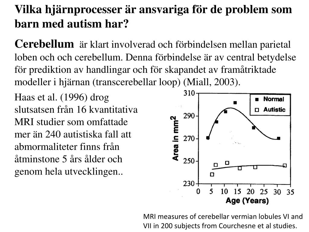Vilkahjärnprocesseräransvarigaför de problem som barn med autism har? Cerebellumärklartinvolveradochförbindelsenmellan parietal lobenochoch cerebellum. Dennaförbindelseärav central betydelseförprediktionavhandlingarochförskapandetavframåtriktademodellerihjärnan (transcerebellar loop) (Miall, 2003). Haas et al. (1996) drogslutsatsenfrån 16 kvantitativa MRI studier somomfattademerän 240 autistiska fall attabmormaliteterfinnsfrånåtminstone 5 årsålderochgenomhelautvecklingen.. MRI measures of cerebellarvermian lobules VI and VII in 200 subjects from Courchesne et al studies.