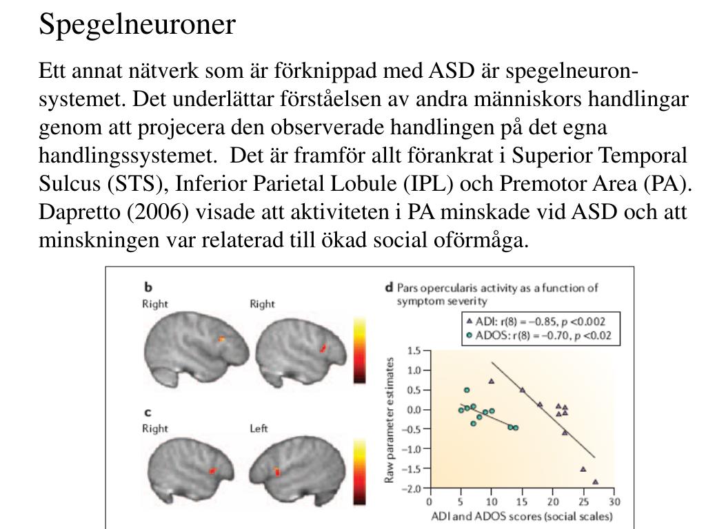 Spegelneuroner Ett annat nätverk som är förknippad med ASD är spegelneuron-systemet. Det underlättar förståelsen av andra människors handlingar genom att projecera den observerade handlingen på det egna handlingssystemet. Det är framför allt förankrat i Superior Temporal Sulcus (STS), Inferior Parietal Lobule (IPL) och Premotor Area (PA). Dapretto (2006) visade att aktiviteten i PA minskade vid ASD och att minskningen var relaterad till ökad social oförmåga.
