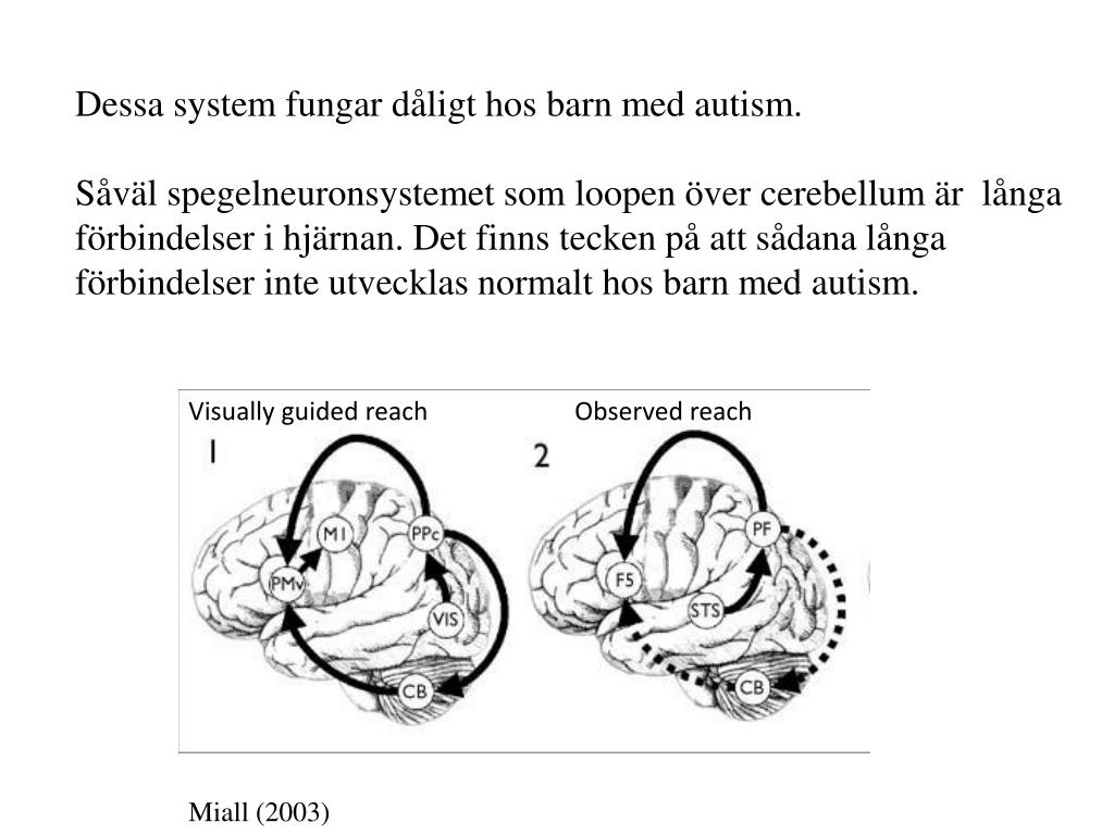 Dessa system fungar dåligt hos barn med autism. Såväl spegelneuronsystemet som loopen över cerebellum är långa förbindelser i hjärnan. Det finns tecken på att sådana långa förbindelser inte utvecklas normalt hos barn med autism. Visually guided reach Observed reach Miall (2003)