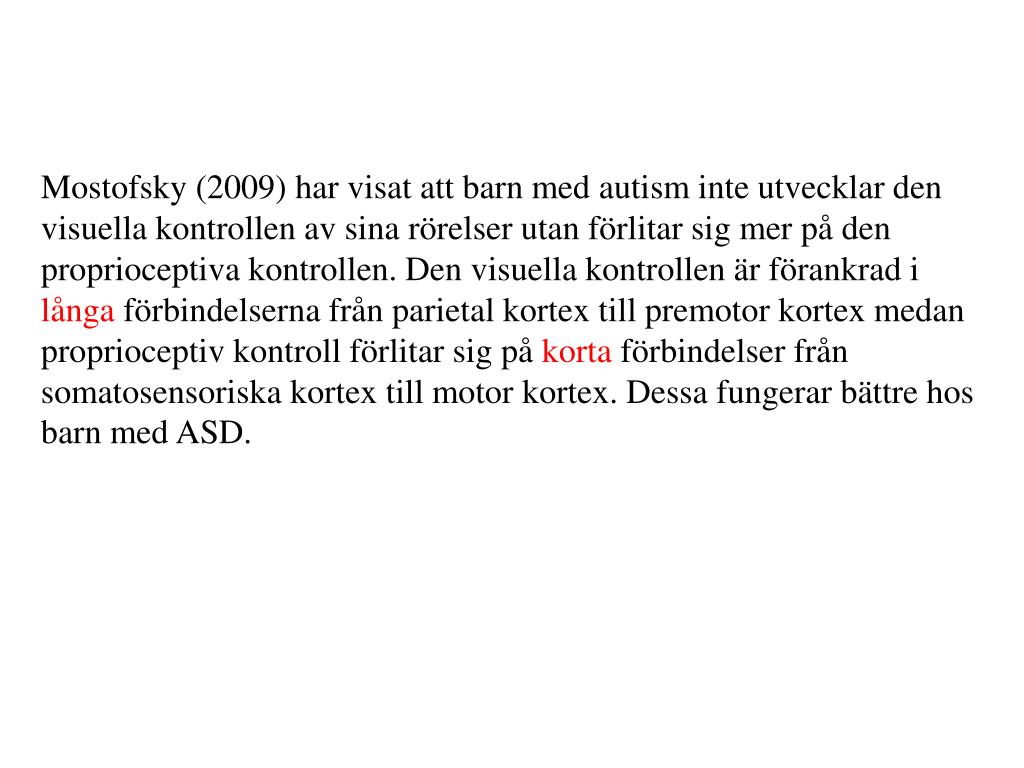 Mostofsky (2009) har visat att barn med autism inte utvecklar den visuella kontrollen av sina rörelser utan förlitar sig mer på den proprioceptiva kontrollen. Den visuella kontrollen är förankrad i långa förbindelserna från parietal kortex till premotorkortex medan proprioceptiv kontroll förlitar sig på korta förbindelser från somatosensoriskakortex till motor kortex. Dessa fungerar bättre hos barn med ASD.