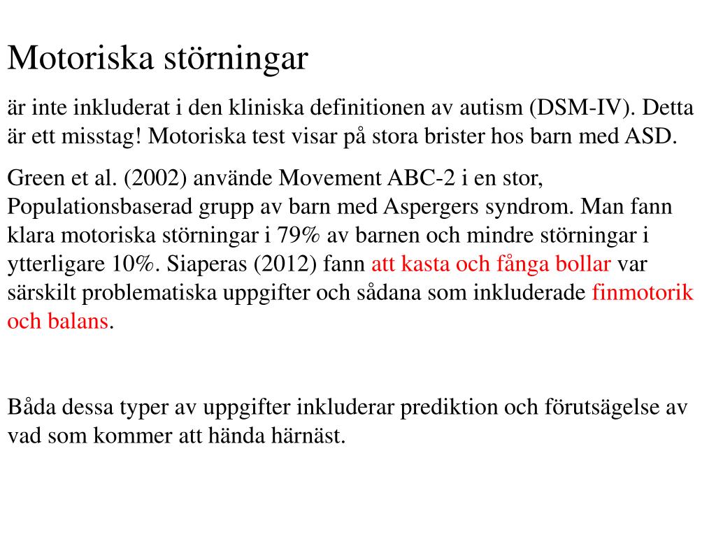 Motoriska störningar är inte inkluderat i den kliniska definitionen av autism (DSM-IV). Detta är ett misstag! Motoriska test visar på stora brister hos barn med ASD. Green et al. (2002) använde Movement ABC-2 i en stor, Populationsbaserad grupp av barn med Aspergers syndrom. Man fann klara motoriska störningar i 79% av barnen och mindre störningar i ytterligare 10%. Siaperas (2012) fann att kasta och fånga bollar var särskilt problematiska uppgifter och sådana som inkluderade finmotorik och balans. Båda dessa typer av uppgifter inkluderar prediktion och förutsägelse av vad som kommer att hända härnäst.