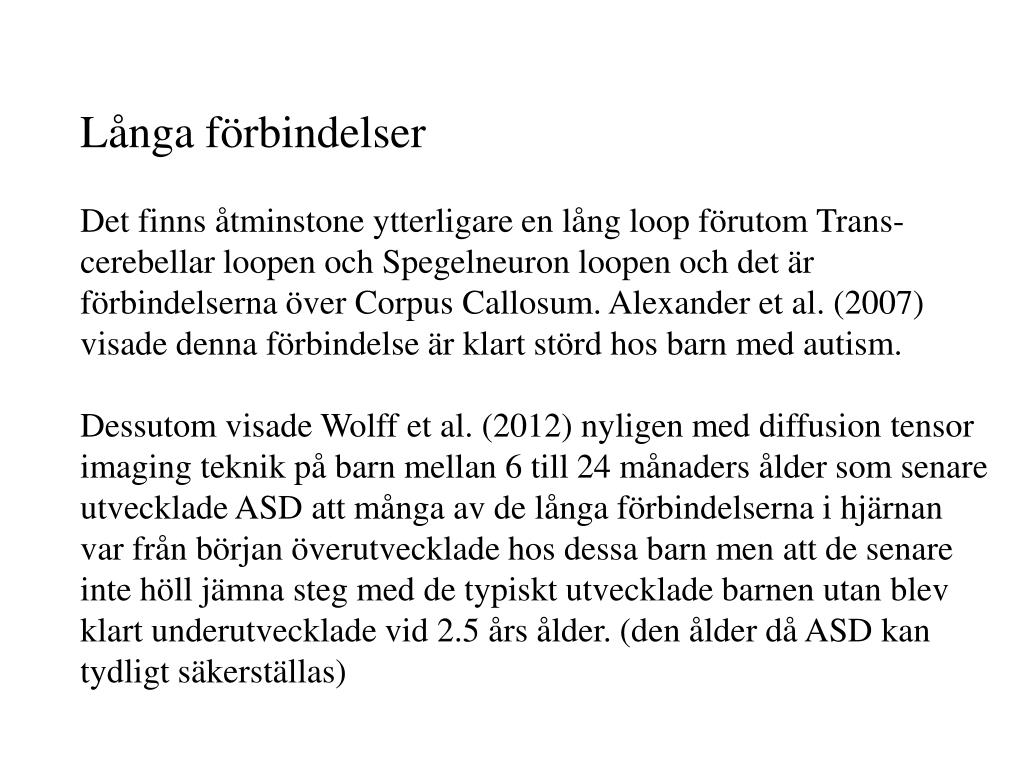 Långa förbindelser Det finns åtminstone ytterligare en lång loop förutom Trans-cerebellar loopen och Spegelneuron loopen och det är förbindelserna över CorpusCallosum. Alexander et al. (2007) visade denna förbindelse är klart störd hos barn med autism. Dessutom visade Wolff et al. (2012) nyligen med diffusion tensorimaging teknik på barn mellan 6 till 24 månaders ålder som senare utvecklade ASD att många av de långa förbindelserna i hjärnan var från början överutvecklade hos dessa barn men att de senare inte höll jämna steg med de typiskt utvecklade barnen utan blev klart underutvecklade vid 2.5 års ålder. (den ålder då ASD kan tydligt säkerställas)