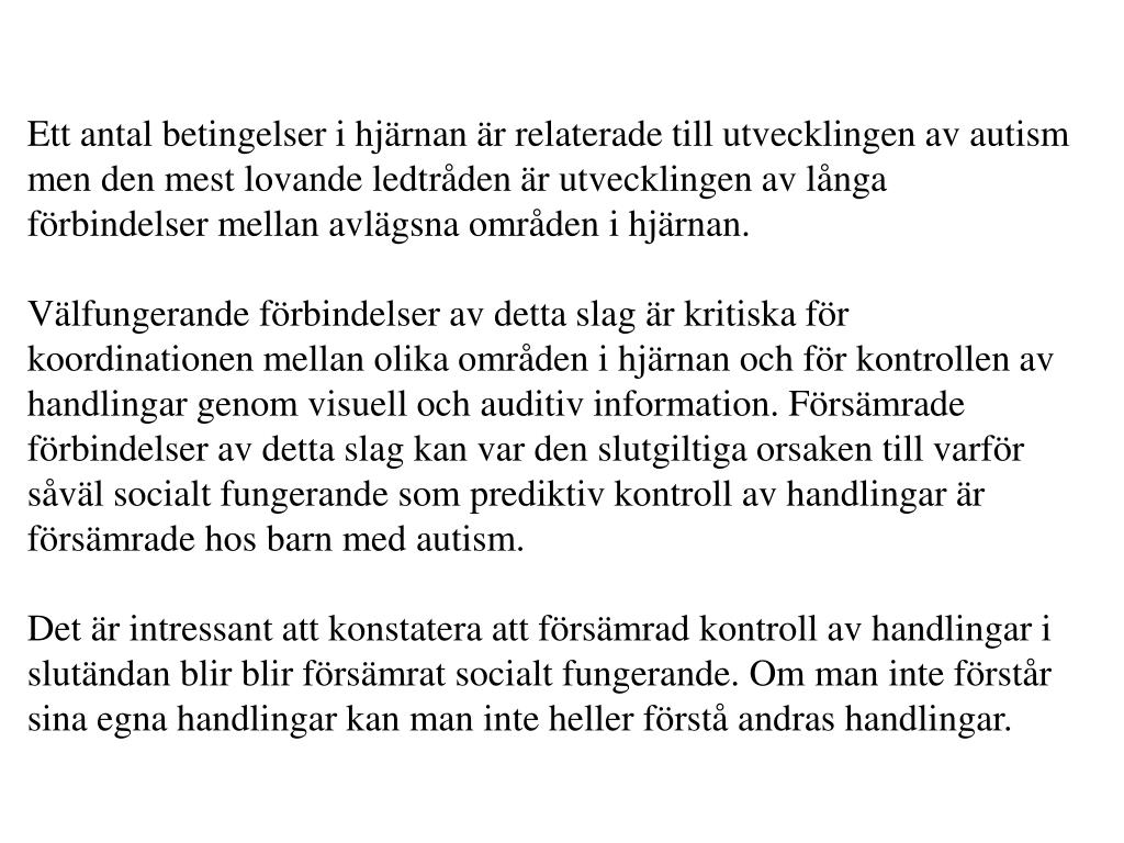 Ett antal betingelser i hjärnan är relaterade till utvecklingen av autism men den mest lovande ledtråden är utvecklingen av långa förbindelser mellan avlägsna områden i hjärnan. Välfungerande förbindelser av detta slag är kritiska för koordinationen mellan olika områden i hjärnan och för kontrollen av handlingar genom visuell och auditiv information. Försämrade förbindelser av detta slag kan var den slutgiltiga orsaken till varför såväl socialt fungerande som prediktiv kontroll av handlingar är försämrade hos barn med autism. Det är intressant att konstatera att försämrad kontroll av handlingar i slutändan blir blir försämrat socialt fungerande. Om man inte förstår sina egna handlingar kan man inte heller förstå andras handlingar.