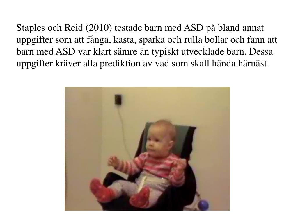 Staples och Reid (2010) testade barn med ASD på bland annat uppgifter som att fånga, kasta, sparka och rulla bollar och fann att barn med ASD var klart sämre än typiskt utvecklade barn. Dessa uppgifter kräver alla prediktion av vad som skall hända härnäst.