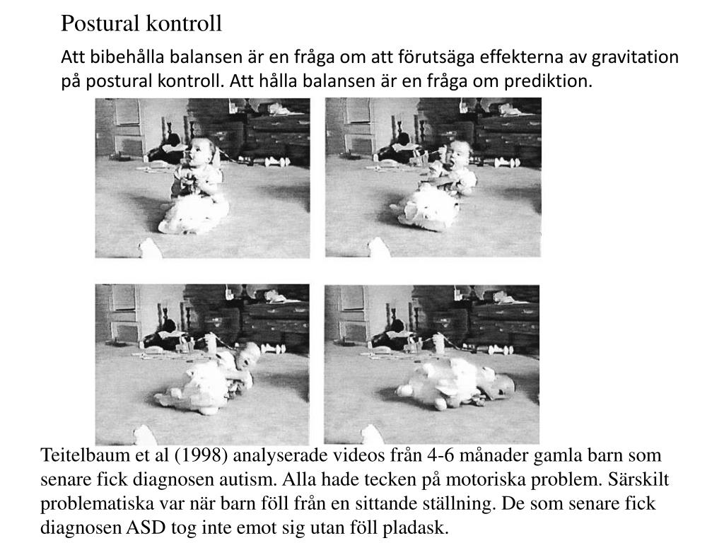 Postural kontroll Att bibehålla balansen är en fråga om att förutsäga effekterna av gravitation på postural kontroll. Att hålla balansen är en fråga om prediktion. Teitelbaum et al (1998) analyserade videos från 4-6 månader gamla barn som senare fick diagnosen autism. Alla hade tecken på motoriska problem. Särskilt problematiska var när barn föll från en sittande ställning. De som senare fick diagnosen ASD tog inte emot sig utan föll pladask.