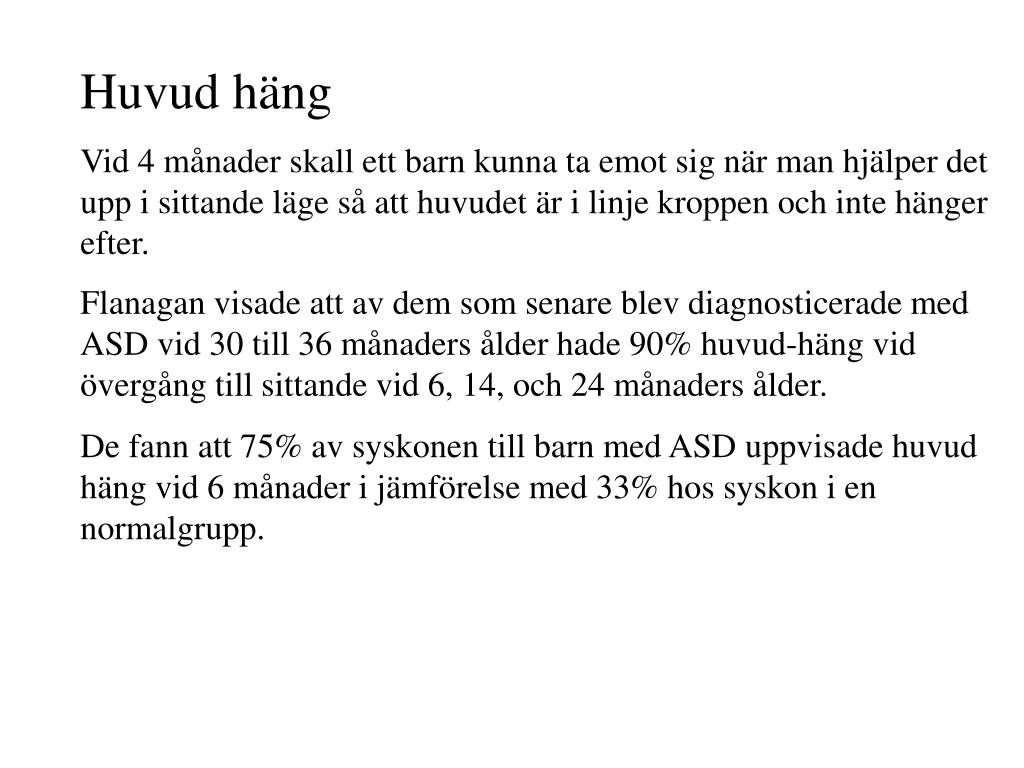 Huvud häng Vid 4 månader skall ett barn kunna ta emot sig när man hjälper det upp i sittande läge så att huvudet är i linje kroppen och inte hänger efter. Flanagan visade att av dem som senare blev diagnosticerade med ASD vid 30 till 36 månaders ålder hade 90% huvud-häng vid övergång till sittande vid 6, 14, och 24 månaders ålder. De fann att 75% av syskonen till barn med ASD uppvisade huvud häng vid 6 månader i jämförelse med 33% hos syskon i en normalgrupp.