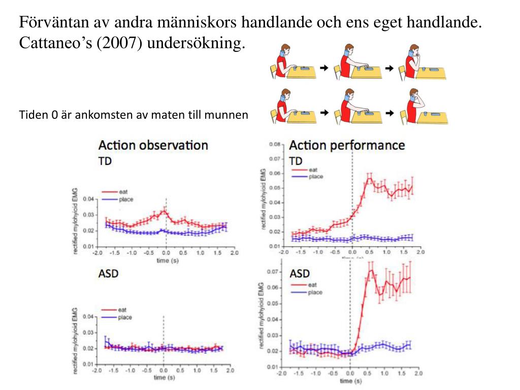 Cattaneo (2007) bad också barn att flytta en papperslapp till 2 olika behållare. Den ena behållaren var öppen och den andra öppnades genom att trycka på en fotpedal. Tryckandet at pedalen borde göras strax innan handen anländer med pappret. Detta var beteendet hos typiskt utvecklade barn men inte hos barn med ASD. Resultatet visar att barn med autism inte kan predicera andra individers handlingar men att de dessutom inte kan förutsäga nästa steg av sitt eget handlande. (De har problem med att förbereda nästa handlingsteg)