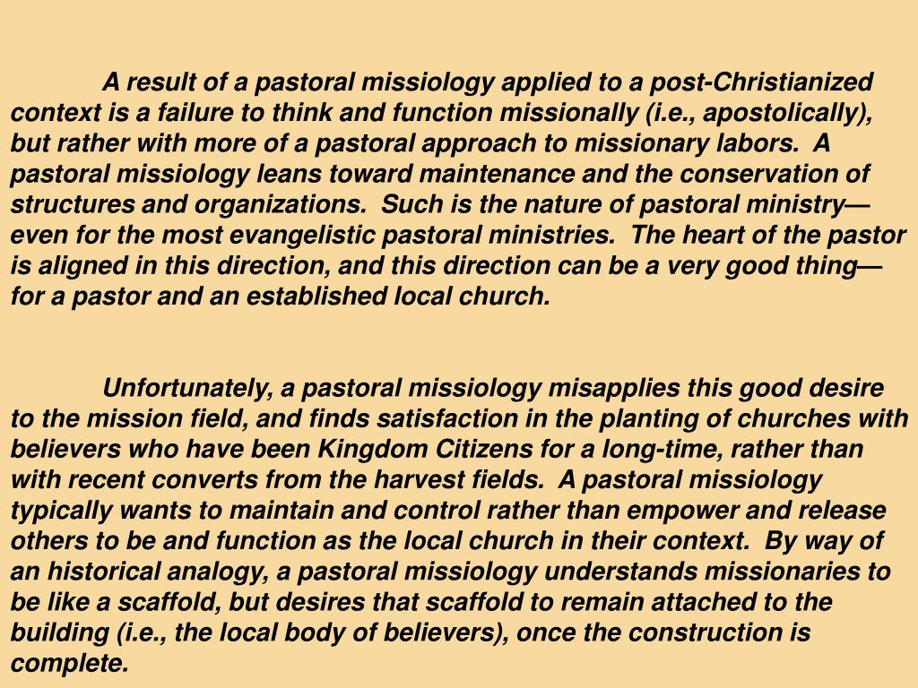 A result of a pastoral missiology applied to a post-Christianized context is a failure to think and function missionally (i.e., apostolically), but rather with more of a pastoral approach to missionary labors. A pastoral missiology leans toward maintenance and the conservation of structures and organizations. Such is the nature of pastoral ministry—even for the most evangelistic pastoral ministries. The heart of the pastor is aligned in this direction, and this direction can be a very good thing—for a pastor and an established local church. Unfortunately, a pastoral missiology misapplies this good desire to the mission field, and finds satisfaction in the planting of churches with believers who have been Kingdom Citizens for a long-time, rather than with recent converts from the harvest fields. A pastoral missiology typically wants to maintain and control rather than empower and release others to be and function as the local church in their context. By way of an historical analogy, a pastoral missiology understands missionaries to be like a scaffold, but desires that scaffold to remain attached to the building (i.e., the local body of believers), once the construction is complete.