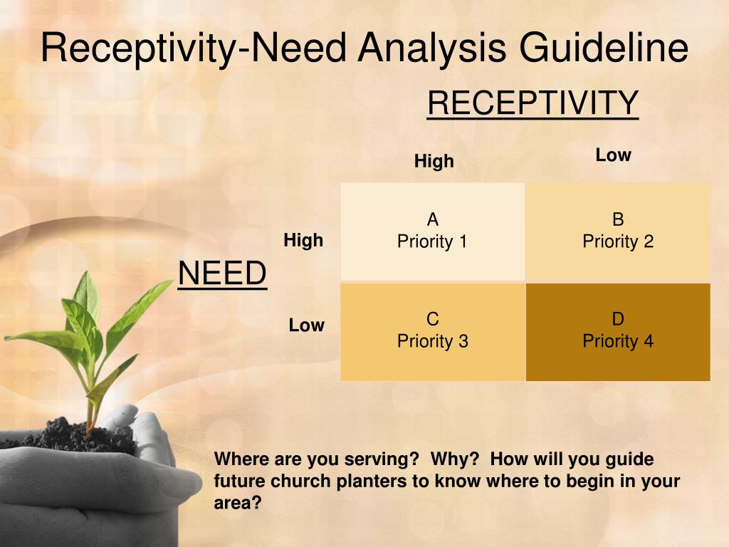 Guideline #3: Determine the Most Receptive and Most Needy Field. In order to be faithful with available resources, church planters should prayerfully locate the peoples and areas where receptivity is high and need is great.