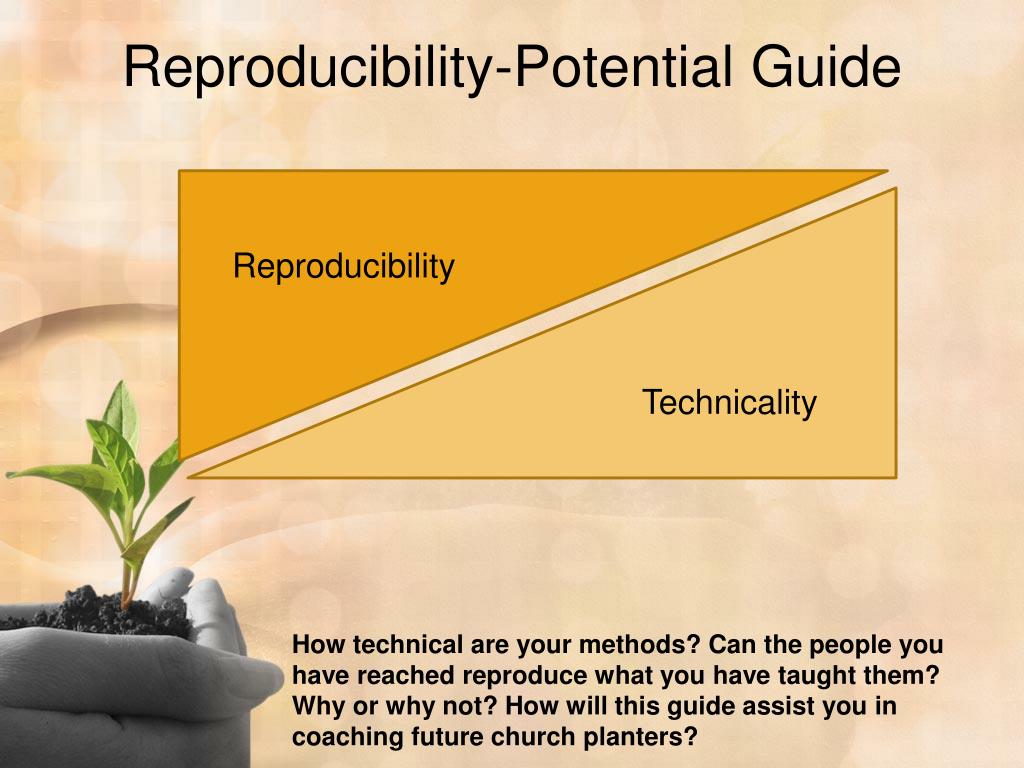 Reproducibility-Potential Guide Reproducibility Technicality How technical are your methods? Can the people you have reached reproduce what you have taught them? Why or why not? How will this guide assist you in coaching future church planters?