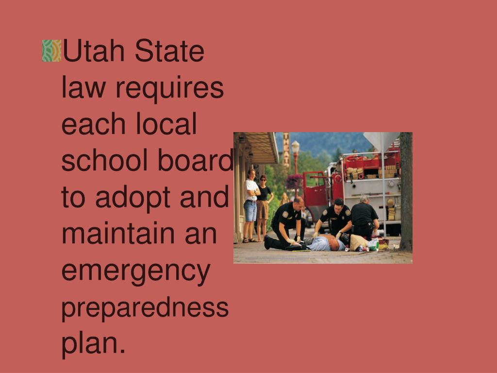Utah State law requires each local school board to adopt and maintain an emergency preparedness plan.