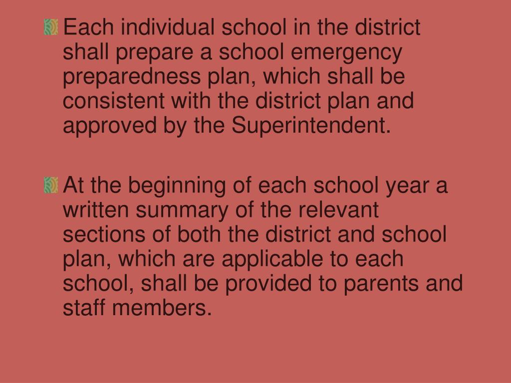 Each individual school in the district shall prepare a school emergency preparedness plan, which shall be consistent with the district plan and approved by the Superintendent. • At the beginning of each school year a written summary of the relevant sections of both the district and school plan, which are applicable to each school, shall be provided to parents and staff members.