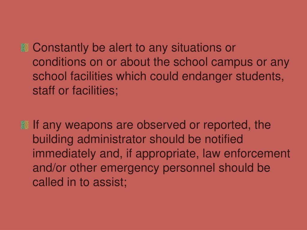 Constantly be alert to any situations or conditions on or about the school campus or any school facilities which could endanger students, staff or facilities; • If any weapons are observed or reported, the building administrator should be notified immediately and, if appropriate, law enforcement and/or other emergency personnel should be called in to assist;