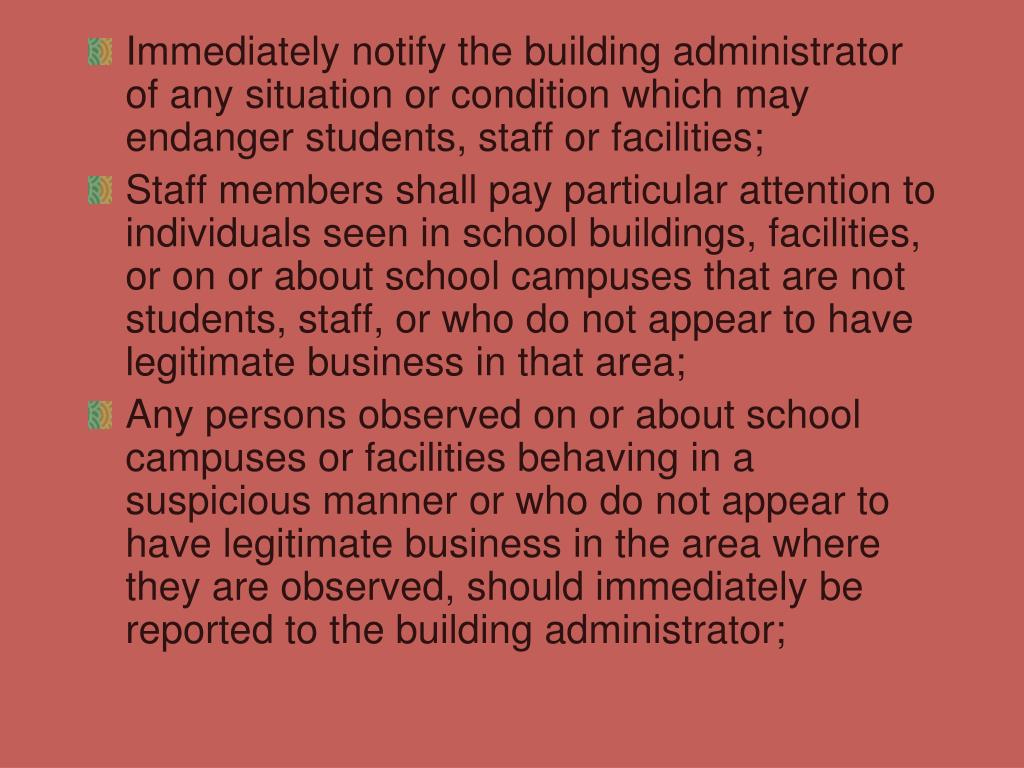 Immediately notify the building administrator of any situation or condition which may endanger students, staff or facilities; • Staff members shall pay particular attention to individuals seen in school buildings, facilities, or on or about school campuses that are not students, staff, or who do not appear to have legitimate business in that area; • Any persons observed on or about school campuses or facilities behaving in a suspicious manner or who do not appear to have legitimate business in the area where they are observed, should immediately be reported to the building administrator;