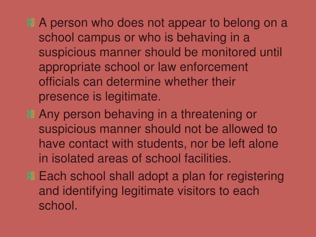 A person who does not appear to belong on a school campus or who is behaving in a suspicious manner should be monitored until appropriate school or law enforcement officials can determine whether their presence is legitimate. • Any person behaving in a threatening or suspicious manner should not be allowed to have contact with students, nor be left alone in isolated areas of school facilities. • Each school shall adopt a plan for registering and identifying legitimate visitors to each school.