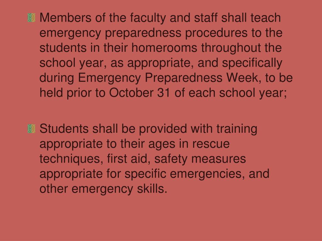 Members of the faculty and staff shall teach emergency preparedness procedures to the students in their homerooms throughout the school year, as appropriate, and specifically during Emergency Preparedness Week, to be held prior to October 31 of each school year; • Students shall be provided with training appropriate to their ages in rescue techniques, first aid, safety measures appropriate for specific emergencies, and other emergency skills.