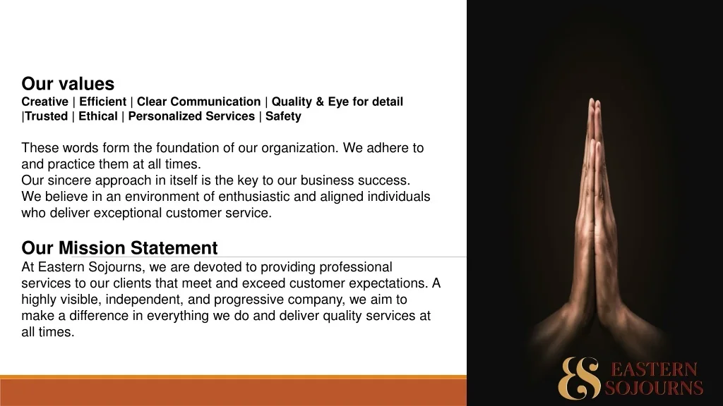 Our values Creative | Efficient | Clear Communication | Quality & Eye for detail |Trusted | Ethical | Personalized Services | Safety These words form the foundation of our organization. We adhere to and practice them at all times. Our sincere approach in itself is the key to our business success. We believe in an environment of enthusiastic and aligned individuals who deliver exceptional customer service. Our Mission Statement At Eastern Sojourns, we are devoted to providing professional services to our clients that meet and exceed customer expectations. A highly visible, independent, and progressive company, we aim to make a difference in everything we do and deliver quality services at all times.