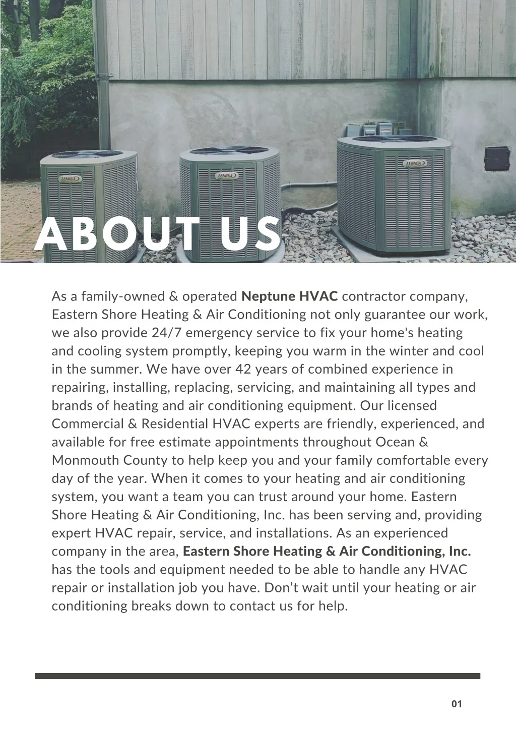 ABOUT US As a family-owned & operated Neptune HVAC contractor company, Eastern Shore Heating & Air Conditioning not only guarantee our work, we also provide 24/7 emergency service to fix your home's heating and cooling system promptly, keeping you warm in the winter and cool in the summer. We have over 42 years of combined experience in repairing, installing, replacing, servicing, and maintaining all types and brands of heating and air conditioning equipment. Our licensed Commercial & Residential HVAC experts are friendly, experienced, and available for free estimate appointments throughout Ocean & Monmouth County to help keep you and your family comfortable every day of the year. When it comes to your heating and air conditioning system, you want a team you can trust around your home. Eastern Shore Heating & Air Conditioning, Inc. has been serving and, providing expert HVAC repair, service, and installations. As an experienced company in the area, Eastern Shore Heating & Air Conditioning, Inc. has the tools and equipment needed to be able to handle any HVAC repair or installation job you have. Don’t wait until your heating or air conditioning breaks down to contact us for help. 01