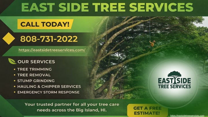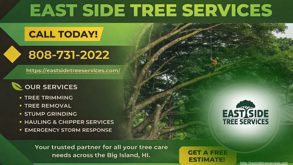 East Side Tree Services offers professional, affordable tree care across Big Island, Hawaii. Services include tree trimming, removal, stump grinding, pruning, cabling, consultations, crown reduction, and emergency assistance. Our experts use boom trucks, chippers, chainsaws, and advanced climbing techniques for trees in difficult spots. We proudly serve Hilo, Keaau, Pahoa, Volcano, Orchidland, Leilani Estates, and the east side of Big Island. Call today for comprehensive tree care you can trust.