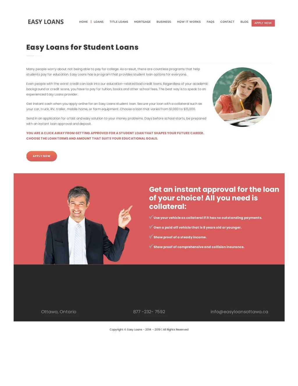 HOME LOANS TITLE LOANS MORTGAGE BUSINESS HOW IT WORKS FAQS CONTACT BLOG APPLY NOW Easy Loans for Student Loans Many people worry about not being able to pay for college. As a result, there are countless programs that help students pay for education. Easy Loans has a program that provides student loan options for everyone. Even people with the worst credit can look into our education-related bad credit loans. Regardless of your academic background or credit score, you have to pay for tuition, books and other school fees. The best way is to speak to an experienced Easy Loans provider. Get instant cash when you apply online for an Easy Loans student loan. Secure your loan with a collateral such as your car, truck, RV, trailer, mobile home, or farm equipment. Choose a loan that varies from $1,000 to $15,000. Send in an application for a fast and easy solution to your money problems. Days before school starts, be prepared with an instant loan approval and deposit. YOU ARE A CLICK AWAY FROM GETTING APPROVED FOR A STUDENT LOAN THAT SHAPES YOUR FUTURE CAREER. CHOOSE THE LOAN TERMS AND AMOUNT THAT SUITS YOUR EDUCATIONAL GOALS. APPLY NOW Get an instant approval for the loan of your choice! All you need is collateral: Use your vehicle as collateral if it has no outstanding payments. Own a paid off vehicle that is 8 years old or younger. Show proof of a steady income. Show proof of comprehensive and collision insurance. Ottawa, Ontario 877 -232- 7592 info@easyloansottawa.ca Copyright © Easy Loans - 2014 - 2019 | All Rights Reserved