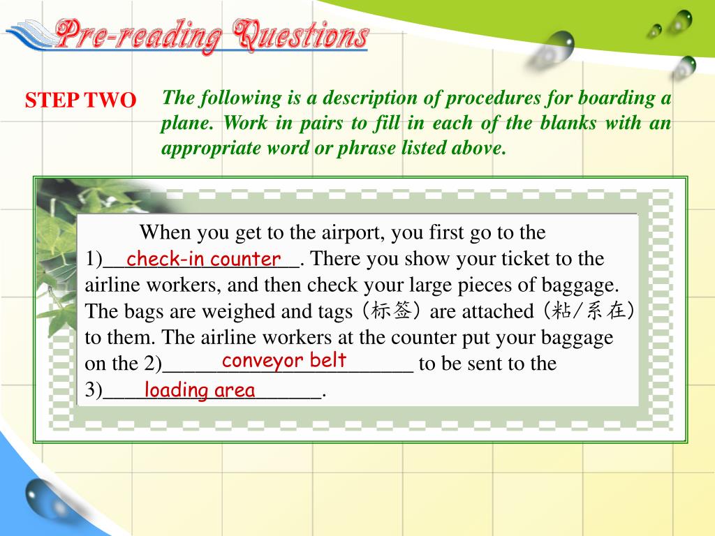 When you get to the airport, you first go to the 1)__________________. There you show your ticket to the airline workers, and then check your large pieces of baggage. The bags are weighed and tags (标签) are attached (粘/系在) to them. The airline workers at the counter put your baggage on the 2)_______________________ to be sent to the 3)____________________. The following is a description of procedures for boarding a plane. Work in pairs to fill in each of the blanks with an appropriate word or phrase listed above. STEP TWO check-in counter conveyor belt loading area