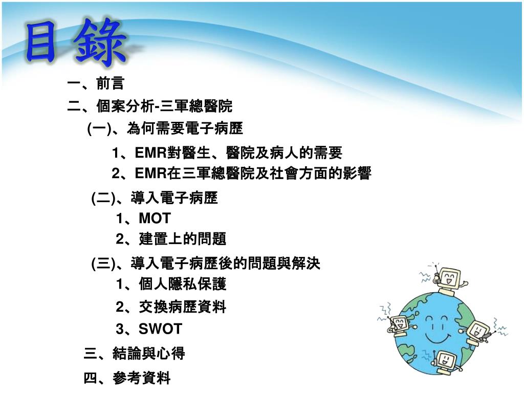 目錄 一、前言 二、個案分析-三軍總醫院 (一)、為何需要電子病歷 1、EMR對醫生、醫院及病人的需要 2、EMR在三軍總醫院及社會方面的影響 (二)、導入電子病歷 1、MOT 2、建置上的問題 (三)、導入電子病歷後的問題與解決 1、個人隱私保護 2、交換病歷資料 3、SWOT 三、結論與心得 四、參考資料