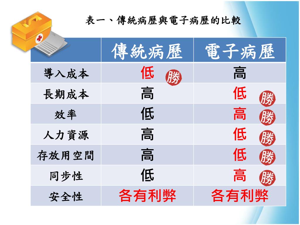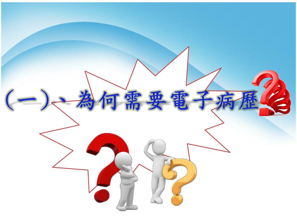 一、前言 隨著科技的進步與網路的發達,人們 對於資料已經不再是用紙張保存了,而是 將其電子化,存放在虛擬的空間裡。 電子病歷若普及後,醫生便能快速地 掌握病人的情況。但在實施的過程中會遇到許多的困難,以下將以三軍總醫院為例探討電子病歷過去的發展與未來展望。