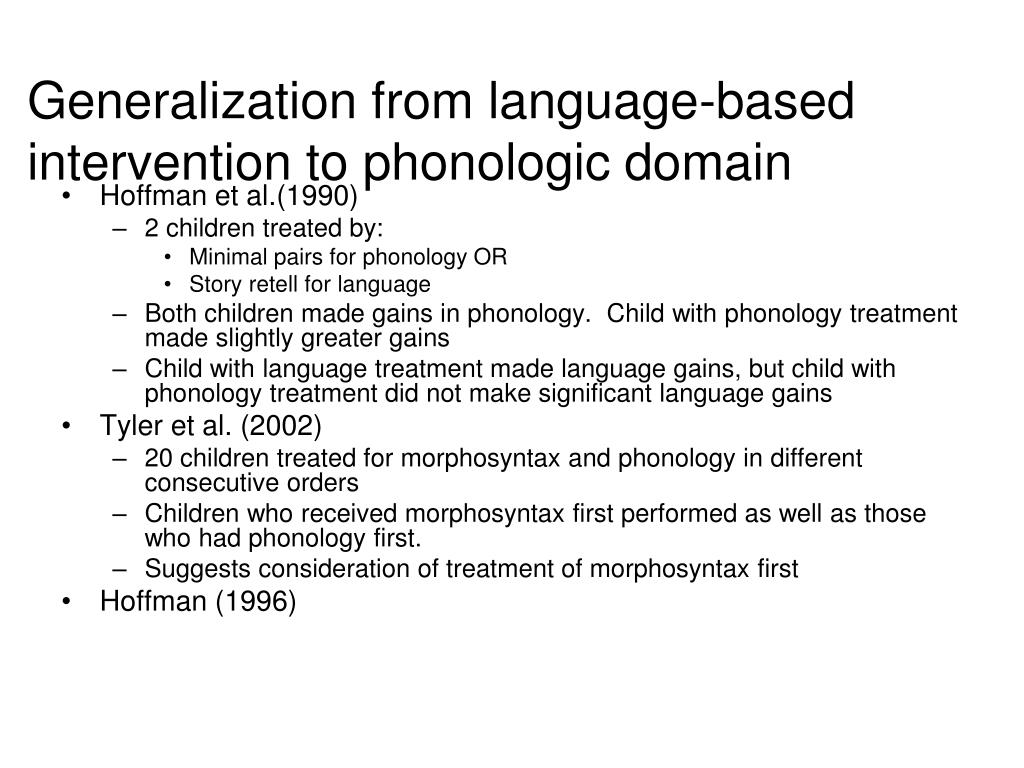 Generalization from language-based intervention to phonologic domain • Hoffman et al.(1990) • 2 children treated by: • Minimal pairs for phonology OR • Story retell for language • Both children made gains in phonology. Child with phonology treatment made slightly greater gains • Child with language treatment made language gains, but child with phonology treatment did not make significant language gains • Tyler et al. (2002) • 20 children treated for morphosyntax and phonology in different consecutive orders • Children who received morphosyntax first performed as well as those who had phonology first. • Suggests consideration of treatment of morphosyntax first • Hoffman (1996)