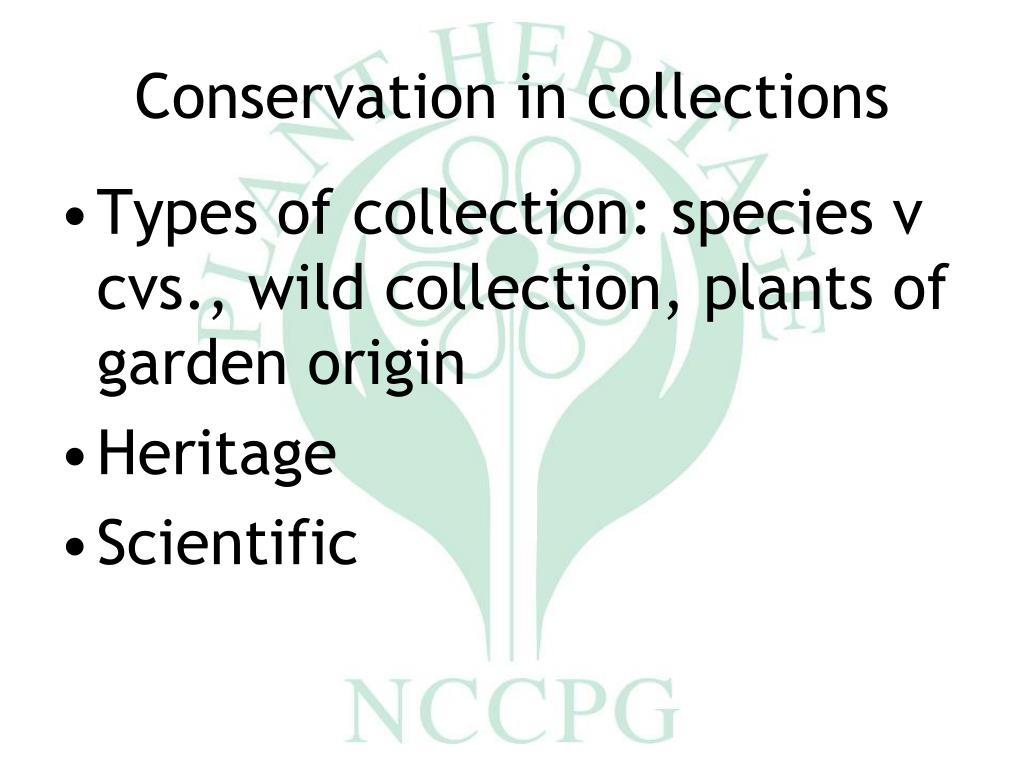 Conservation in collections Types of collection: species v cvs., wild collection, plants of garden origin Heritage Scientific