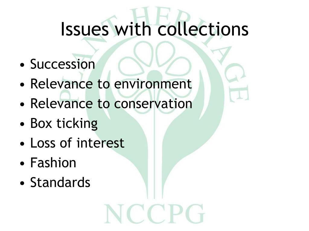 Issues with collections Succession Relevance to environment Relevance to conservation Box ticking Loss of interest Fashion Standards