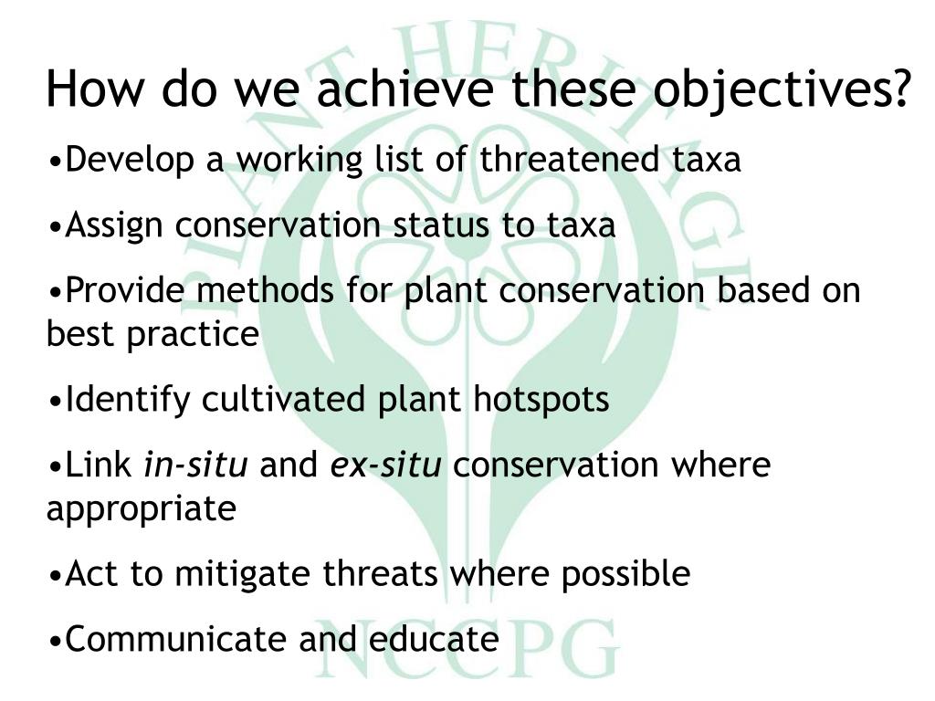 How do we achieve these objectives? • Develop a working list of threatened taxa • Assign conservation status to taxa • Provide methods for plant conservation based on best practice • Identify cultivated plant hotspots • Link in-situ and ex-situ conservation where appropriate • Act to mitigate threats where possible • Communicate and educate
