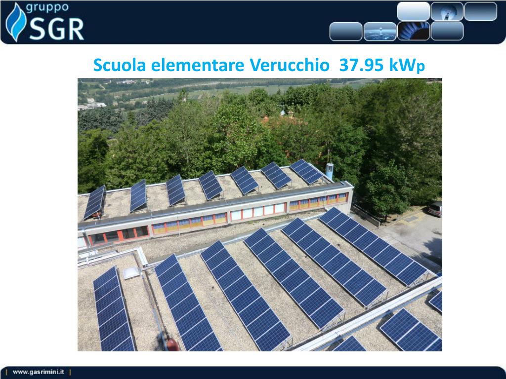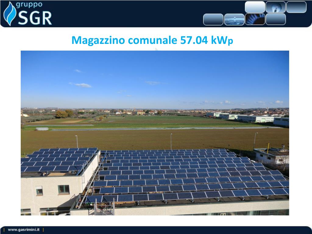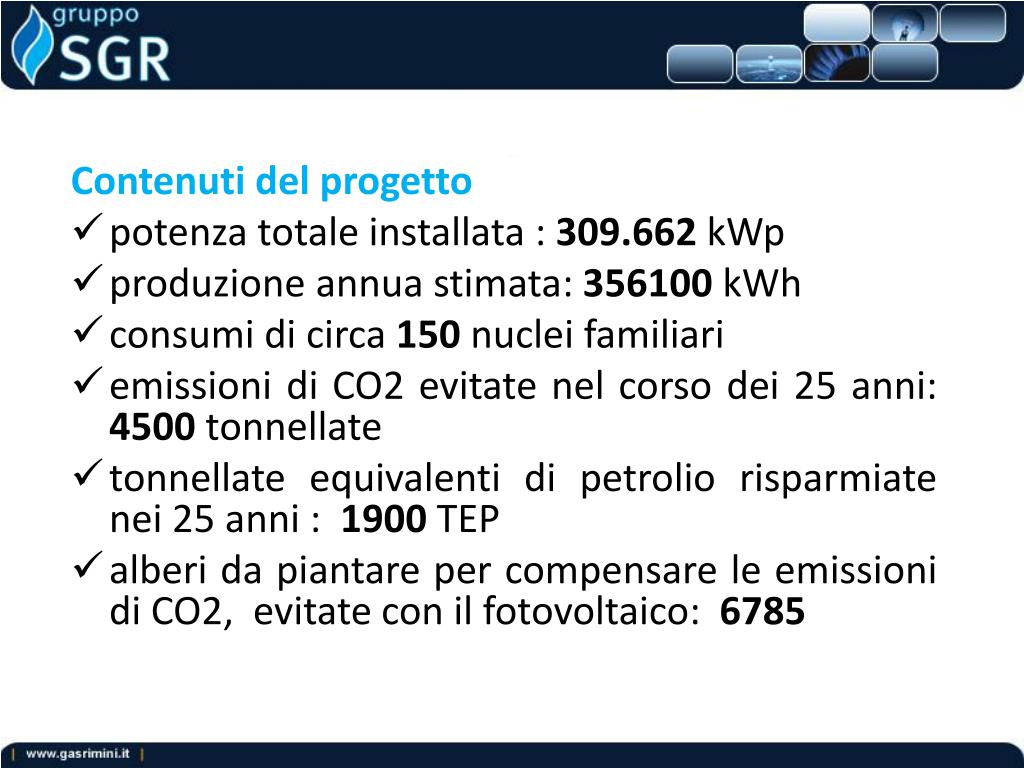 Contenuti del progetto • potenza totale installata : 309.662kWp • produzione annua stimata: 356100 kWh • consumi di circa 150 nuclei familiari • emissioni di CO2 evitate nel corso dei 25 anni: 4500 tonnellate • tonnellate equivalenti di petrolio risparmiate nei 25 anni : 1900 TEP • alberi da piantare per compensare le emissioni di CO2, evitate con il fotovoltaico: 6785