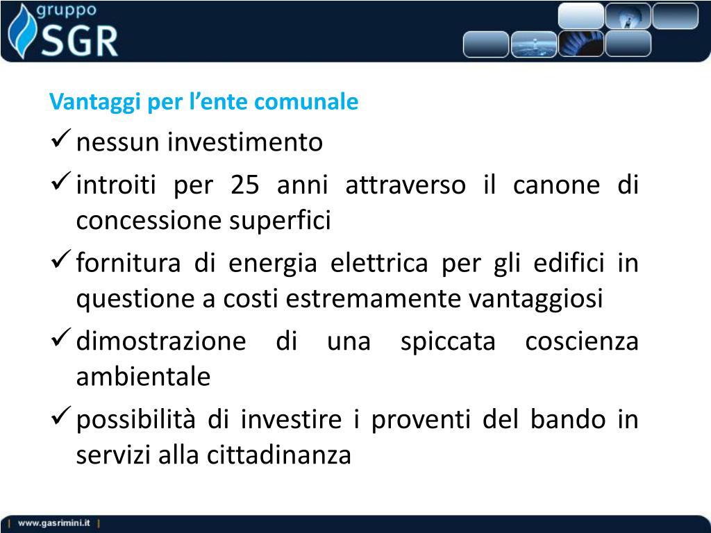 Vantaggi per l’ente comunale • nessun investimento • introiti per 25 anni attraverso il canone di concessione superfici • fornitura di energia elettrica per gli edifici in questione a costi estremamente vantaggiosi • dimostrazione di una spiccata coscienza ambientale • possibilità di investire i proventi del bando in servizi alla cittadinanza