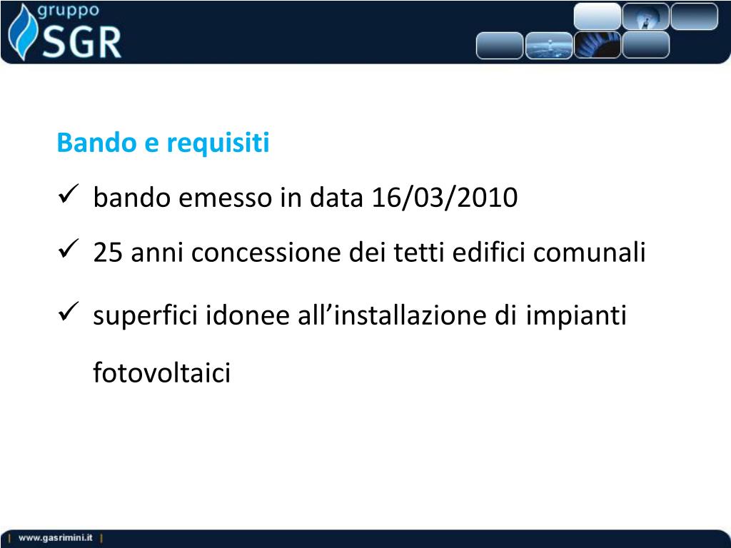 Bando e requisiti • bando emesso in data 16/03/2010 • 25 anni concessione dei tetti edifici comunali • superfici idonee all’installazione diimpianti fotovoltaici
