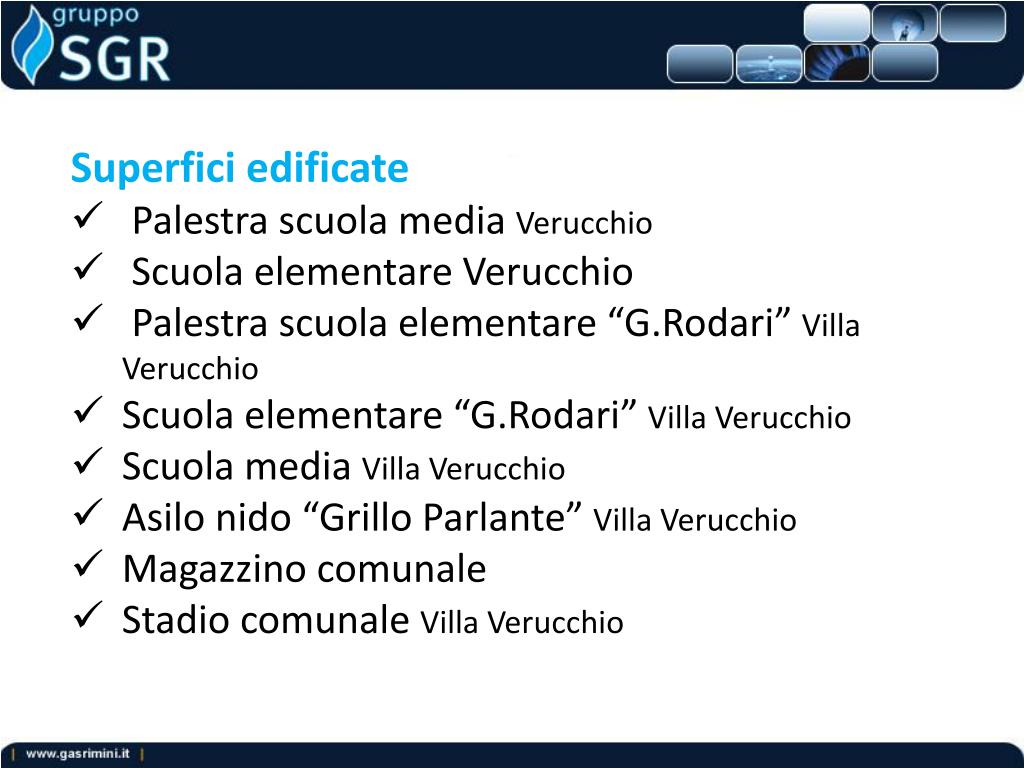 Superfici edificate • Palestra scuola media Verucchio • Scuola elementare Verucchio • Palestra scuola elementare “G.Rodari” Villa Verucchio • Scuola elementare “G.Rodari” Villa Verucchio • Scuola media Villa Verucchio • Asilo nido “Grillo Parlante” Villa Verucchio • Magazzino comunale • Stadio comunale Villa Verucchio