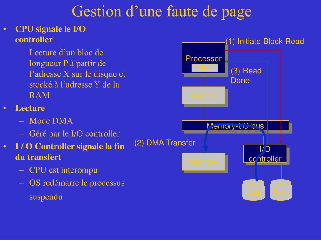Gestion d’une faute de page disk Disk • CPU signale le I/O controller • Lecture d’un bloc de longueur P à partir de l’adresse X sur le disque et stocké à l’adresse Y de la RAM • Lecture • Mode DMA • Géré par le I/O controller • I / O Controller signale la fin du transfert • CPU est interompu • OS redémarre le processus suspendu (1) Initiate Block Read Processor Reg (3) Read Done Cache Memory-I/O bus (2) DMA Transfer I/O controller Memory disk Disk
