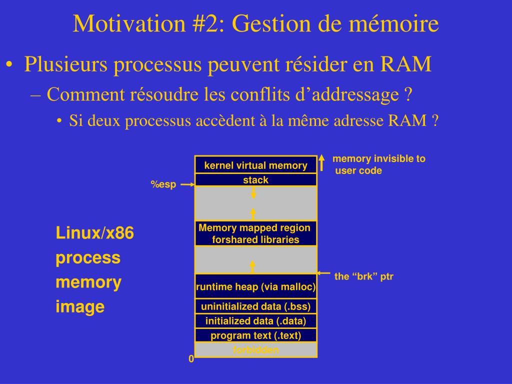 Motivation #2: Gestion de mémoire • Plusieurs processus peuvent résider en RAM • Comment résoudre les conflits d’addressage ? • Si deux processus accèdent à la même adresse RAM ? memory invisible to user code kernel virtual memory stack %esp Memory mapped region forshared libraries Linux/x86 process memory image the “brk” ptr runtime heap (via malloc) uninitialized data (.bss) initialized data (.data) program text (.text) forbidden 0