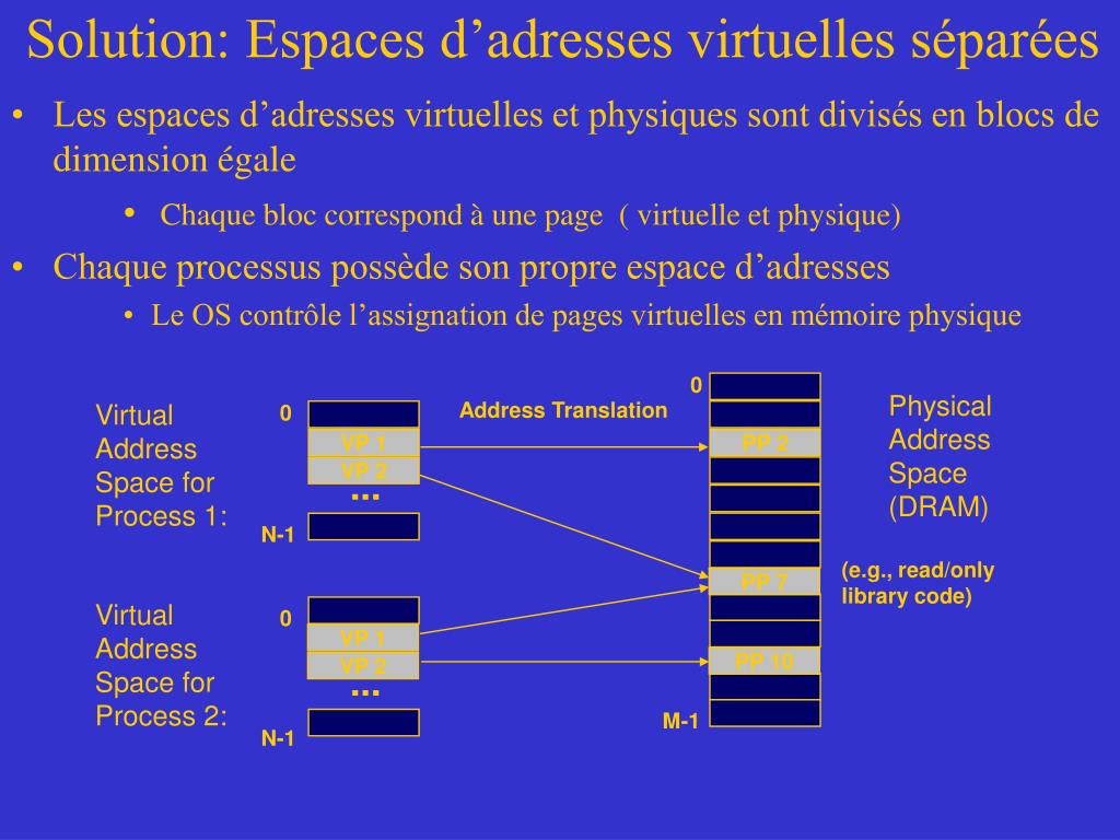 Solution: Espaces d’adresses virtuelles séparées • Les espaces d’adresses virtuelles et physiques sont divisés en blocs de dimension égale • Chaque bloc correspond à une page ( virtuelle et physique) • Chaque processus possède son propre espace d’adresses • Le OS contrôle l’assignation de pages virtuelles en mémoire physique 0 Physical Address Space (DRAM) Address Translation Virtual Address Space for Process 1: 0 VP 1 PP 2 VP 2 ... N-1 (e.g., read/only library code) PP 7 Virtual Address Space for Process 2: 0 VP 1 PP 10 VP 2 ... M-1 N-1