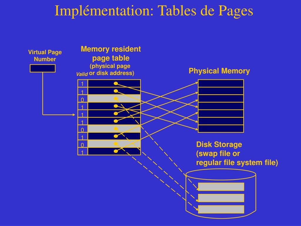 Implémentation: Tables de Pages Memory resident page table (physical page or disk address) Virtual Page Number Physical Memory Valid 1 1 0 1 1 1 0 1 Disk Storage (swap file or regular file system file) 0 1