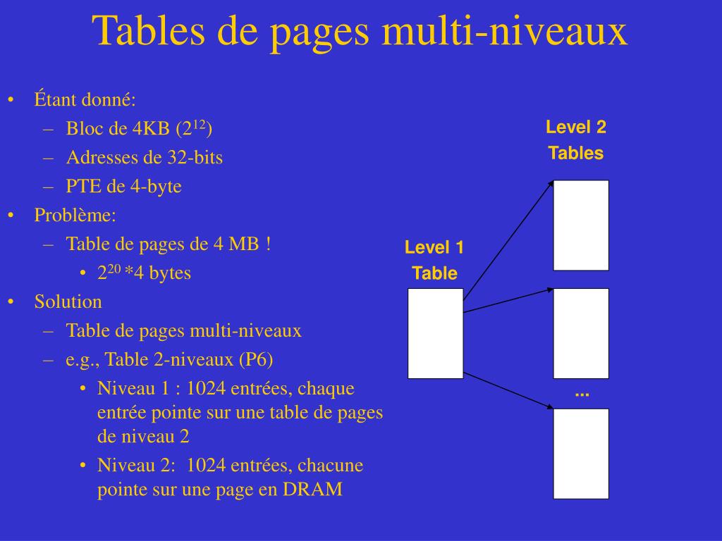 Tables de pages multi-niveaux • Étant donné: • Bloc de 4KB (212) • Adresses de 32-bits • PTE de 4-byte • Problème: • Table de pages de 4 MB ! • 220 *4 bytes • Solution • Table de pages multi-niveaux • e.g., Table 2-niveaux (P6) • Niveau 1 : 1024 entrées, chaque entrée pointe sur une table de pages de niveau 2 • Niveau 2: 1024 entrées, chacune pointe sur une page en DRAM Level 2 Tables Level 1 Table ...